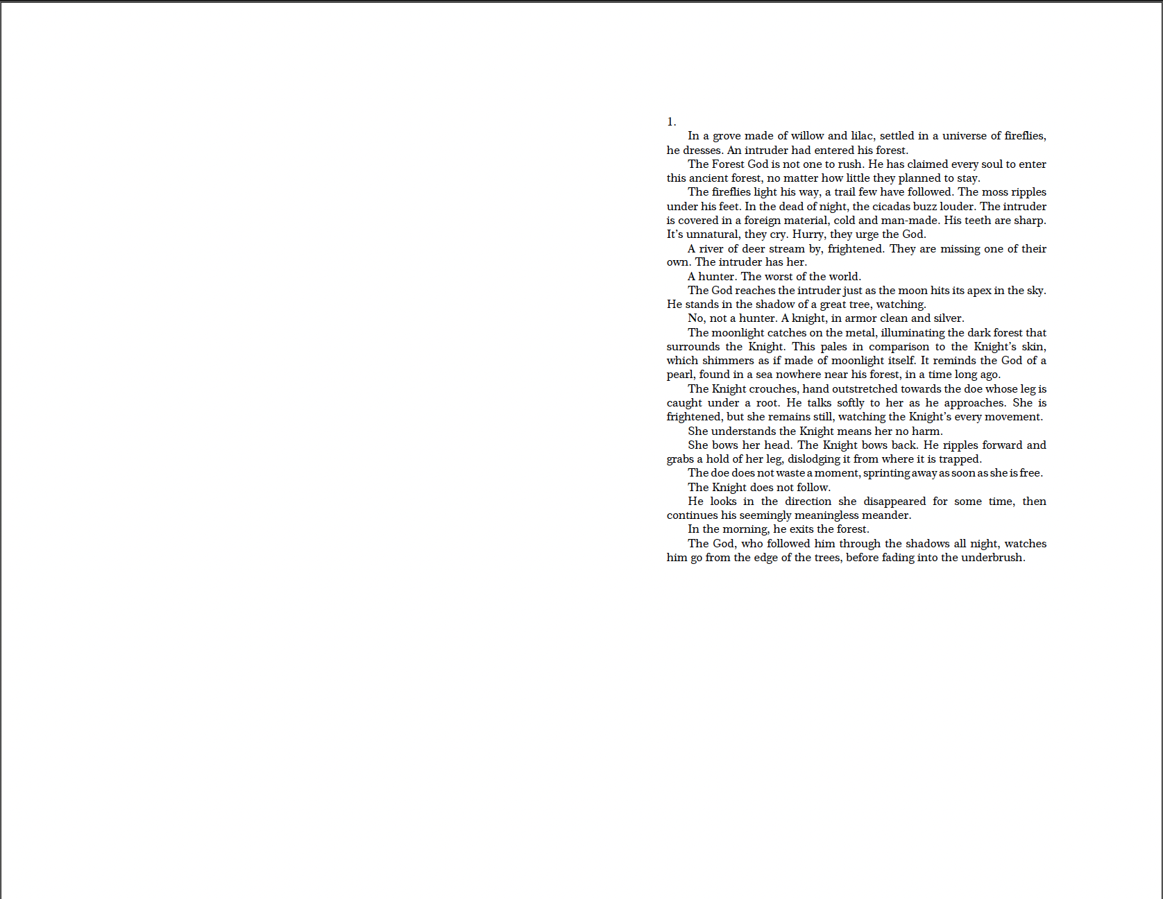 A fairytale-like story of a Forest God and the Knight who is sent to kill him. It is known that all who enter to forest die at the hands of the Forest God, so when the Knight instead encounters a young man, so pale and distant he could be a spirit, it is his duty to save the Boy. It is an unlikely friendship as the Boy, much like the forest, goes through seasons of learning, growing, and blooming in this romantic and thoughtful journey.